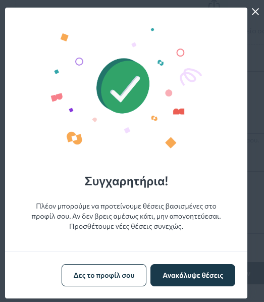 Αμέσως μετά τη συμπλήρωση του προφίλ σου με τουλάχιστον μία καταχώριση εμπειρίας, θα σου προταθεί να ελέγξεις τις εξατομικευμένες προτάσεις θέσεων εργασίας.